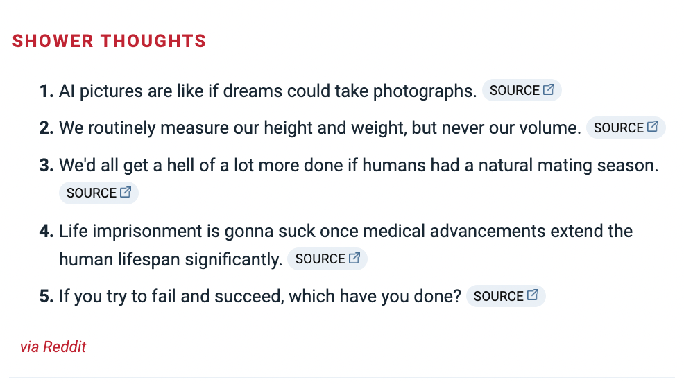 O The Hustle faz bastante disso através de comentários do Reddit, nessa seção de “SHOWER THOUGHTS”.
