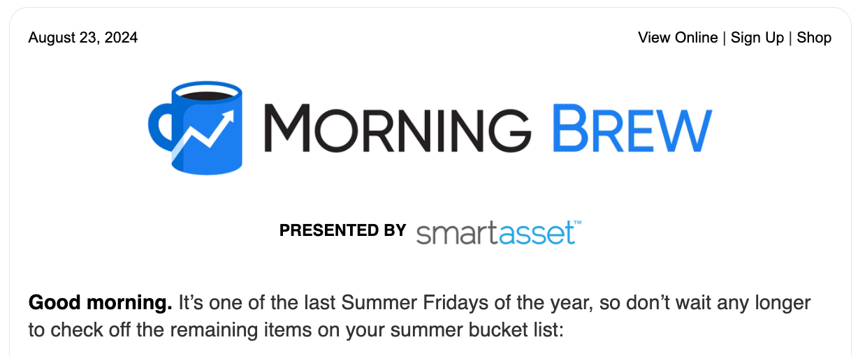 O padrão é sempre o mesmo: Logo do Morning Brew + Logo do patrocinador + Mensagem de bom dia, com um tom bem-humorado (que eu cortei uma parte pra ficar menor 😅).